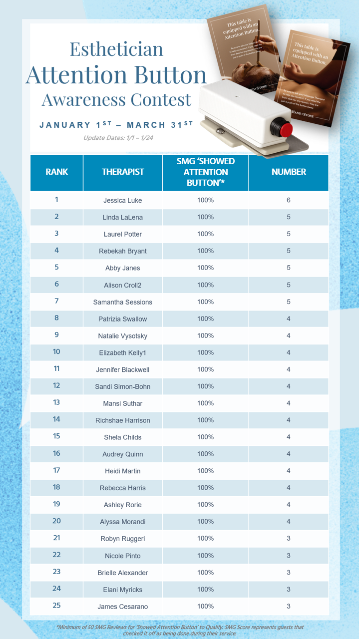 We are closing in on the first month of results for the NEW Attention Button Awareness Contest—and we’re excited to share the Leaderboard! This contest runs January 1 – March 31, recognizing Massage Therapists and Estheticians who make client comfort and communication a priority. Small moments create big trust—and it shows!